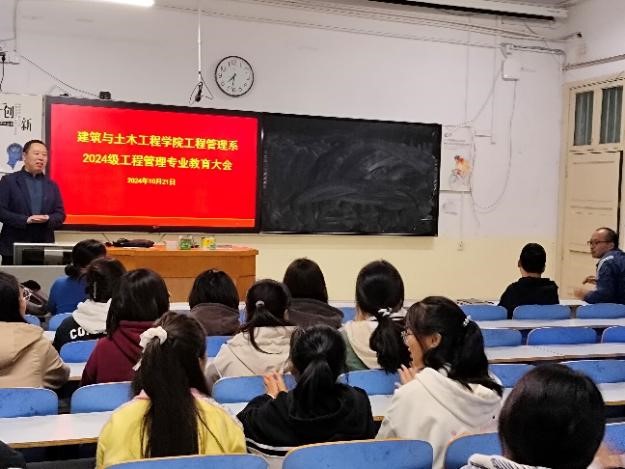 1021日晚,工程管理系在J3-312教室举行了工程管理专业新生入学教育活动。学院党委副书记王凯、工程管理系主任张宗领、系内部分教师代表以及全体工程管理专业新生参加了活动。张宗领详细介绍了工程管理系的师资力量、办公地点、BIM中心、学科竞赛、考研情况以及学院为同学们考研提供的支持服务,并对新生提出了具体建议。教师代表们分别从专业内涵、专业前景、课程设置、学习方法及考研准备等方面进行了详细阐述,鼓励学生努力学好专业知识。在师生交流互动环节,老师们耐心解答了同学们的提问。最后,王凯结合亲身经历,分享了励志故事,激励同学们树立专业信心,并提出了“三个主动”要求:主动学习,将学习从外在任务变为内在探索;主动沟通,积极求教以拓宽视野;主动实践,将理论与实际结合,深化自身技能。