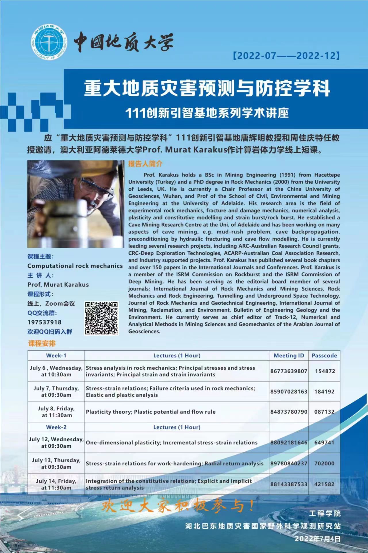 该讲座由中国地质大学工程学院和湖北巴东地质灾害国家野外科学观测研究站联合主办,由澳大利亚阿德莱德大学Murat Karakus教授主讲,唐辉明教授和周佳庆特任教授组织,讲座内容为计算岩体力学线上课程,共6学时。