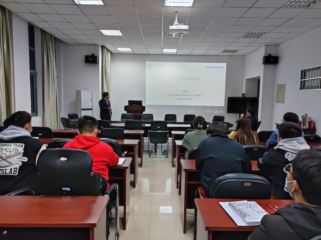 2022年11月17日晚上,永利集团官网院长、河南省高等学校优秀共产党员周葆春同志在综合实验楼206室为研究生讲思想政治理论课,学习党的教育方针,寄语研究生新生,副院长肖琪聃,研究生班主任马文强和2022级全体研究生参加了本次活动,会议由肖琪聃主持。