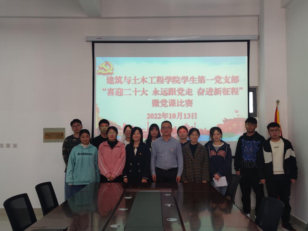 擦亮青春底色,筑梦接续奋斗。为教育引导学生党员在学思践悟中坚定理想信念,在奋发有为中践行初心使命,以优异成绩迎接党的二十大胜利召开,10月13日,建筑与土木工程学院学生第一党支部在综合实验楼402会议室开展了“喜迎二十大 永远跟党走 奋进新征程”微党课比赛活动。学院党委副书记冀鹏,党支部书记张海燕和支部全体党员参加活动。