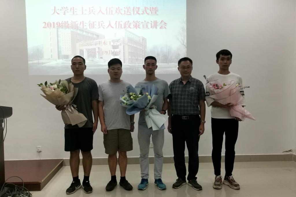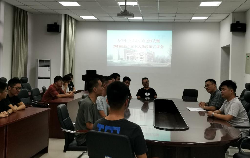 为进一步落实学校征兵工作会议精神,建筑与土木工程学院于9月8日下午召开了2019年大学生士兵入伍欢送仪式暨新生应征政策宣讲会。学院党委副书记方明科、武装干事张晓博、退役大学生代表凡洋洋、本次入伍大学生张萌阳、王玉杰、原中海以及部分入伍积极分子代表参加了本次会议。