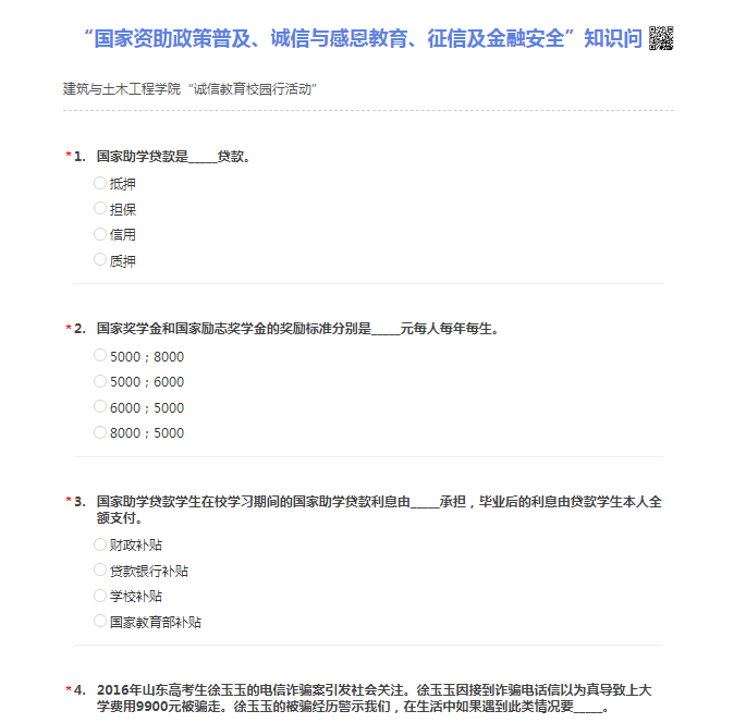 6月13日-6月14日,我院利用网络,开展了“国家资助政策普及、诚信与感恩教育、征信及金融安全”知识问卷,设计单选题20道,多选题10道,简答题1道,参与网络答题的学生有519人,达到学院在校生人数的97%,学生参与率高。
