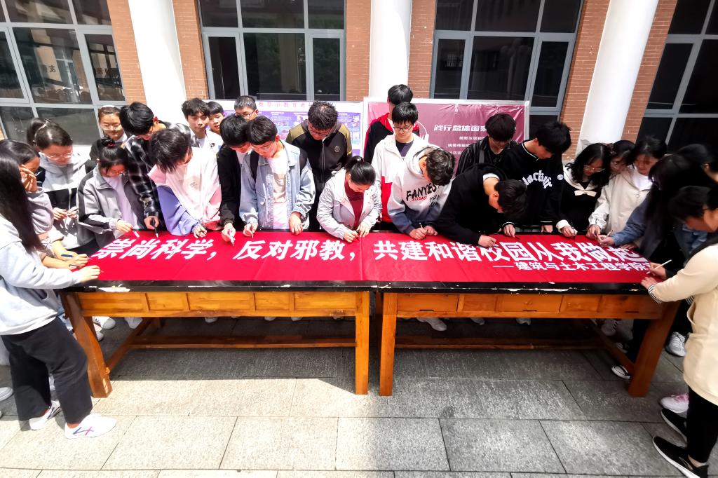 4月15日下午,学院在综合实验楼广场组织开展反邪教警示教育主题活动。活动上,同学们首先观看了《失陷的乐园》等主题教育短片,通过学习视频资料,同学们进一步认清了邪教的本质,从根本上、源头上预防了邪教的滋生,营造了和谐稳定的校园环境。接着,同学们来到综合实验楼小广场,在《反邪教警示教育进校园》主题展板前,学院团委书记张晓博为同学们讲解了大学生受邪教侵害案例,这些案例深深触动了同学们的内心,让他们从更深层次上了解到邪教组织对我们身心健康造成的伤害与影响,帮助他们提升了明辨是非的能力;了解了“法轮功”、“全能神”等邪教组织的本质与骗人的伎俩,树立起自觉抵制邪教渗透的防范意识。最后,同学们在“崇尚科学,反对邪教,共建和谐校园从我做起。”条幅上签下了自己的名字,坚定了做有理想、有信念的新时代大学生,努力把自己锻炼成为社会主义事业的建设者和接班人。(建筑与土木工程学院 陈瑜苹)