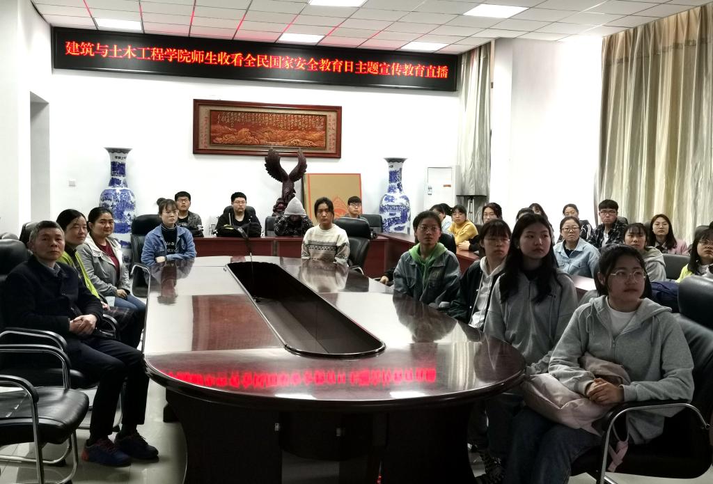 4月15日是第六个全民国家安全教育日,为深入贯彻落实习近平中国特色社会主义思想和党的十九大精神,鼓励广大师生积极学习和践行国家总体安全观,努力营造庆祝建党100周年良好氛围,进一步提高广大师生的防邪意识与安全意识。4月15日,建筑与土木工程学院在综合实验楼206会议室、综合实验楼广场组织开展了全民国家安全教育日系列主题教育活动,学院党委书记黄学玉、副书记方明科、全体辅导员、来自学院各个年级的学生代表参加了本次活动。