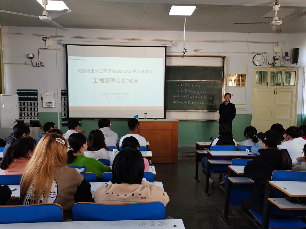 为帮助新生树立专业思想,培养专业意识,根据建筑与土木工程学院2021级新生入学教育工作安排,10月13日上午,学院邀请工程管理系主任、副教授李建楠老师在教二T5教室为2021级新生作工程管理专业认知专题辅导。学院党委书记方明科、副书记冀鹏与2021级工程管理专业新生一起聆听了辅导报告。