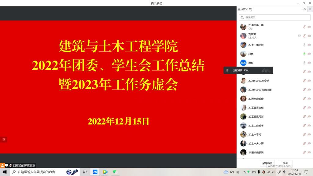 为进一步加强对学院团委、学生会的组织领导,更好地服务学生成长成才,建筑与土木工程学院于2022年12月15日1:00通过腾讯会议召开了“2022年团委、学生会工作总结暨2023年工作务虚会”,党委副书记冀鹏,专职辅导员邓林,团委、学生会全体成员参会。