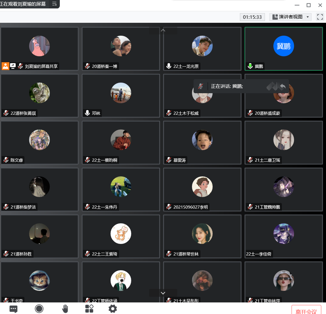 冀鹏总结讲话,充分肯定了本年度团委、学生会的工作成效,回答了同学们提出的班级管理、课程安排等各种问题。他强调,第一,团委、学生会要合理利用寒假,通过线上、线下相结合,做好安全、感恩、劳动、文明养成的各方面的教育工作。第二,积极组织开展好寒假志愿服务工作,让大学生们在社会锻炼中长本领,增才干。第三,团委、学生会、各个社团要善于思考,创新工作方法,为下学期工作高质量完成做好充分准备。第四,各班级利用寒假主动作为,完善班级管理和班风、学风建设,为同学们营造宽松、和谐、优良的学习环境。