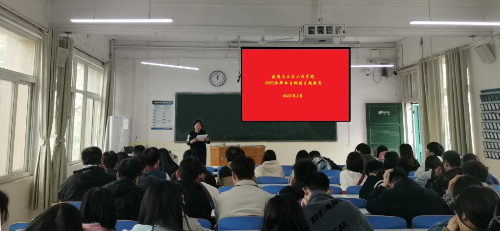 为普及征信知识,激励同学们做诚实守信师院人,5月15日中午,建筑与土木工程学院在教312教室开展了诚信主题教育,毕业班班主任张海燕、专职辅导员邓林和2023届毕业生代表参加。