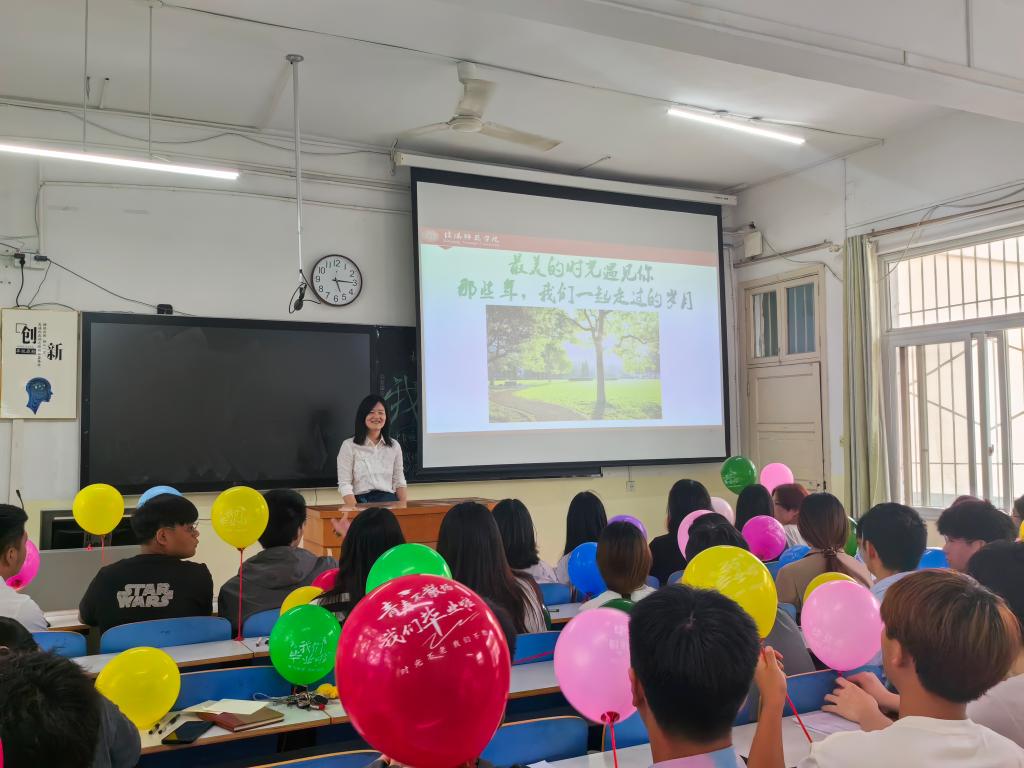 张海燕以视频短片的方式带领同学们回顾了一起走过的四年大学生活的美好时光。同学们汇报了自己在校四年来取得的成绩,并表达了对母校的感恩、不舍和美好祝愿。为了激励同学们心怀梦想,砥砺奋斗,张海燕与同学们许下毕业后的“十年之约”,每位同学写下毕业十年里的梦想,装进45颗“梦想胶囊”,约定十年返校聚会时一起打开“梦想胶囊”,见证彼此梦想的实现。