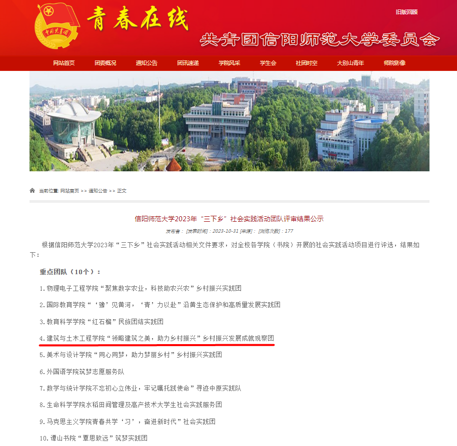 近日,永利集团官网2023年“三下乡”社会实践活动评审会公布评审结果,我院的“领略建筑之美,助力乡村振兴”乡村振兴发展成就观察团被评为重点团队。