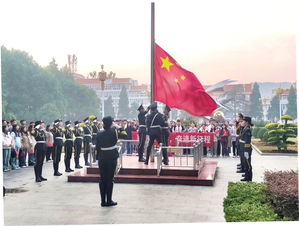 6时30分,国旗护卫队迈着整齐划一、铿锵有力的步伐,护送着五星红旗走向升旗台。伴随着雄壮豪迈的国歌,鲜艳的五星红旗冉冉升起,全体师生肃然静立,自觉向国旗行注目礼,齐声高唱国歌。2024级新生代表马如一、凯丽·比努尔、李善灏和李冠斌声情并茂地带来诗歌朗诵《新时代 新青年》。党员代表、2022级土木工程1班龙光原作了题为“做新时代有为青年”的演讲,表示作为新时代青年,要在专业学习上攻坚克难,在社会实践中勇攀高峰,把青春的奋斗足迹印在祖国大地上。