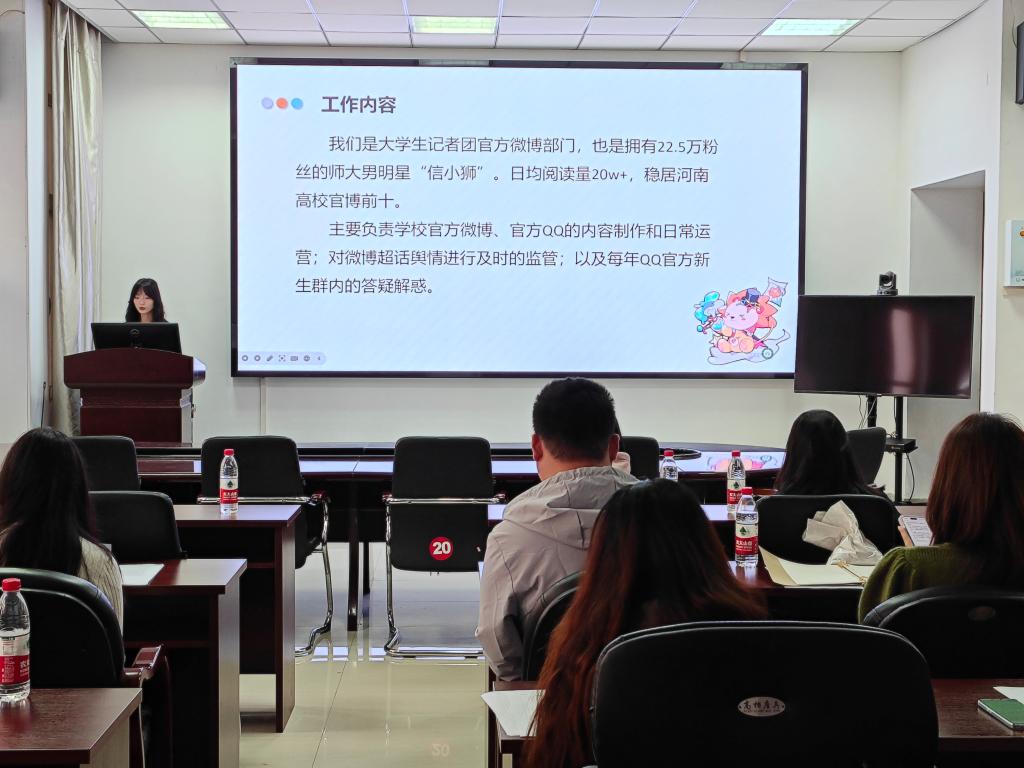 王凯对王存选和大学生记者团的到来表示由衷的感谢,他强调,学院新媒体不仅肩负着新闻报道、舆论宣传和思想文化建设的重任,更是意识形态工作的重要阵地。他对学院新媒体成员们提出了几点要求:一是提升专业素养,不断学习新闻采编、摄影摄像、视频剪辑等专业技能,确保报道内容的准确性和时效性,以高度的责任心对待每一条新闻信息,力求做到精益求精。二是增强创新意识,紧跟时代步伐,积极探索新媒体传播的新形式、新途径,利用短视频、直播、H5互动等新媒体手段,丰富报道形式,提升传播效果,吸引更多师生的关注与参与。三是强化责任担当,要坚持正确的舆论导向,传播正能量,弘扬主旋律,为学院营造良好的思想文化氛围。四是加强团队协作,新媒体工作涉及多个环节,需要同学们密切配合,相互支持、相互学习,形成合力。