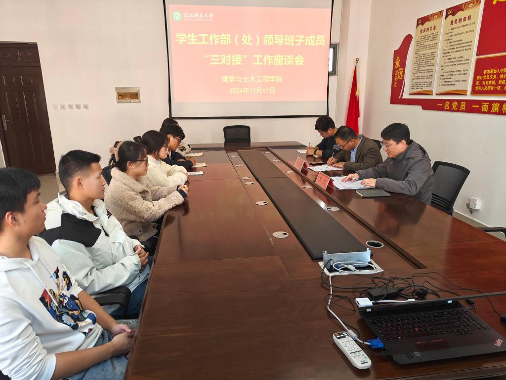 会上,王凯介绍了建筑与土木工程学院学生工作基本情况,传达了学校《学生工作部(处)领导班子“三对接”制度》精神。班主任冯舒心介绍了对接班级2023级土木工程2班的基本情况。互动交流环节,学生们积极踊跃地分享了他们在思想动态、学业进展、日常生活等方面情况,并坦诚地表达了在生涯规划、班级管理、升学就业等方面所遇到的挑战与困惑。同时,他们还就学生管理工作优化、后勤服务提升、宿舍环境改善等问题,提出了一系列富有建设性的意见与建议。与会领导、老师认真倾听、详细记录,针对学生们提出的问题与困惑,逐一给予解答和指导。