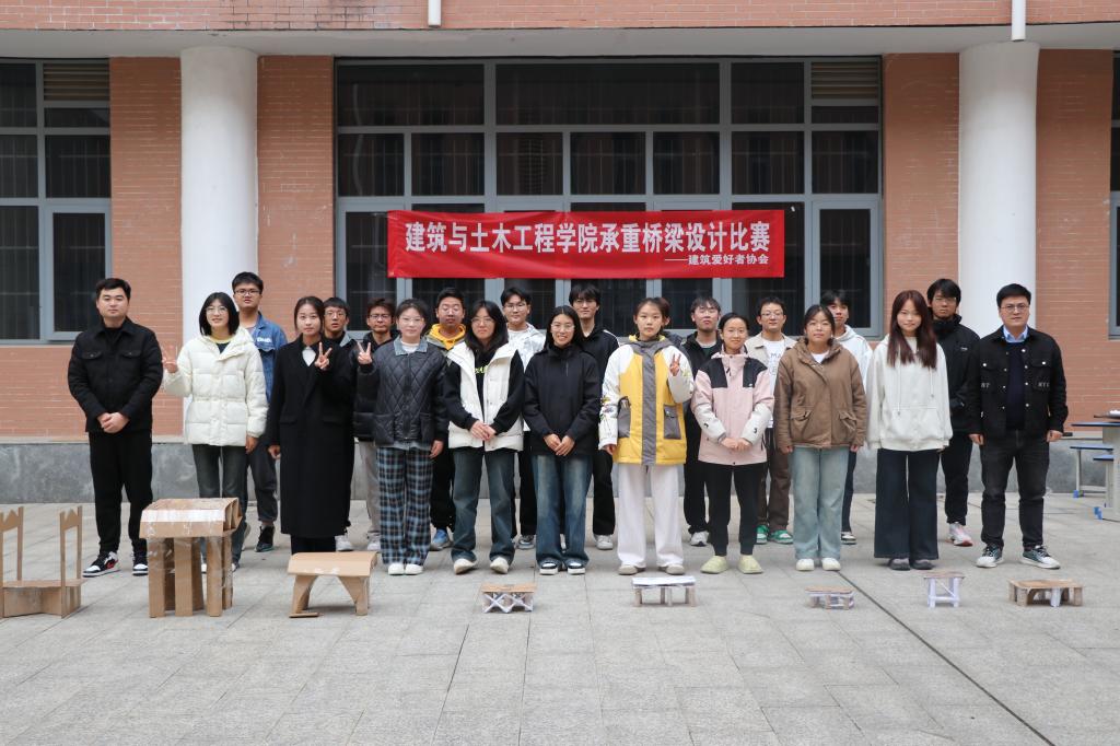 11月23日下午,建筑与土木工程学院建筑爱好者协会在综合实验楼小广场举办承重桥梁设计大赛,学院团委负责人冯舒心,社团指导老师吕强、社团部分学生以及参赛选手参加活动。