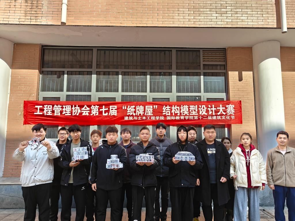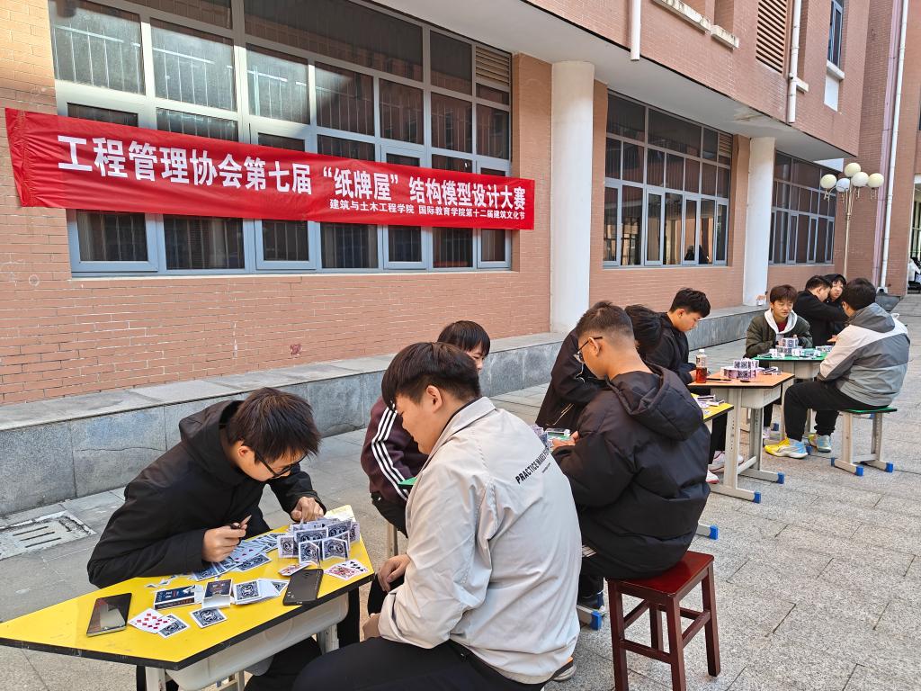12月1日上午,建筑与土木工程学院在综合实验楼小广场举办第七届“纸牌屋”结构模型设计大赛。工程管理协会指导老师吴志强、社团部分学生以及参赛选手参加活动。