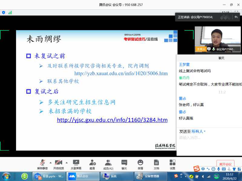4月22日上午,永利集团官网专门利用考研指导群和腾讯会议的形式,组织召开了2020届学生考研复试的“云指导”专题课堂。60余名考研学子参加了本次云上指导会。