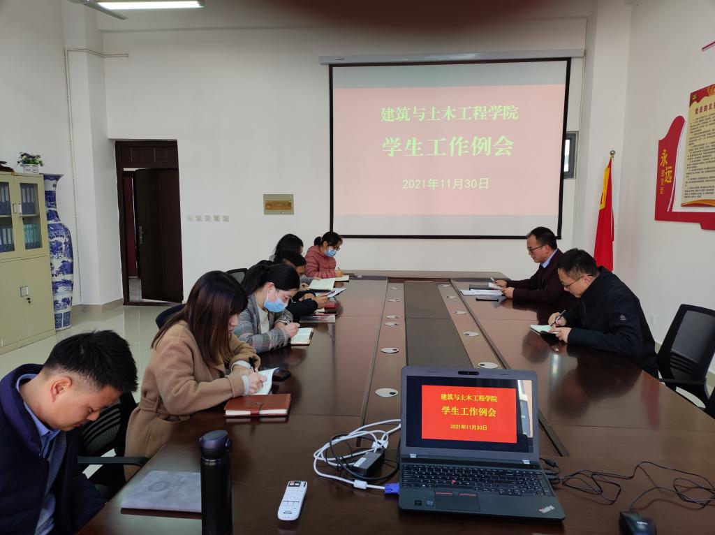 11月30日下午,建筑与土木工程学院在综合实验楼402会议室召开学生工作会。学院党委书记方明科、副书记冀鹏和全体专兼职辅导员(班主任)参加会议。会议由冀鹏主持。