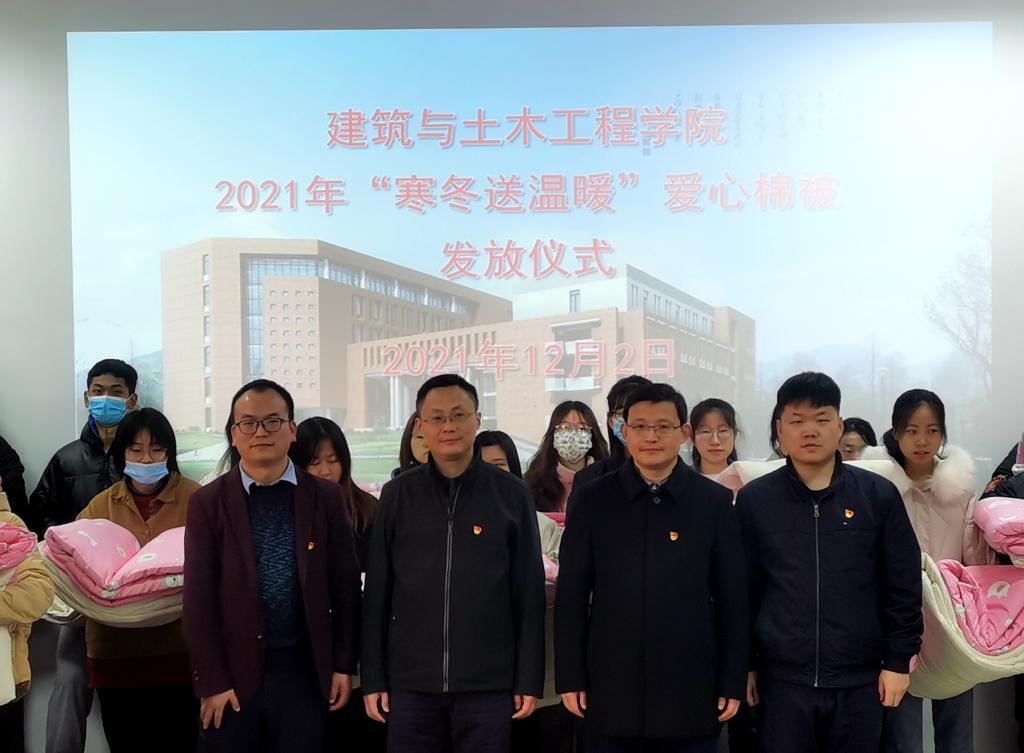 活动中,方明科宣读了《建筑与土木工程学院2021年“寒冬送温暖”爱心棉被资助学生名单》,方明科、周葆春为受资助学生现场发放了爱心棉被。