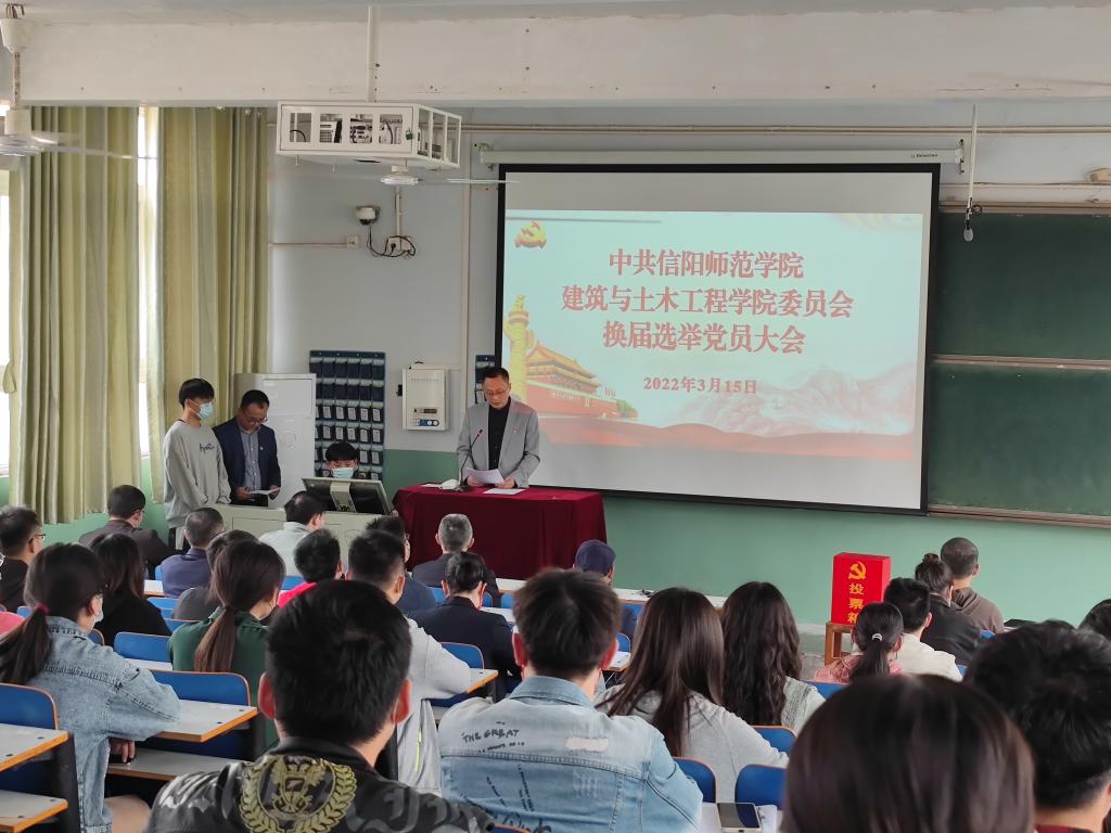 3月15日下午,中共信阳师范学院建筑与土木工程学院委员会换届选举党员大会在教二楼T5教室顺利召开。学院全体正式党员参加了会议,部分预备党员代表和入党积极分子代表列席会议。会议由冀鹏同志主持。