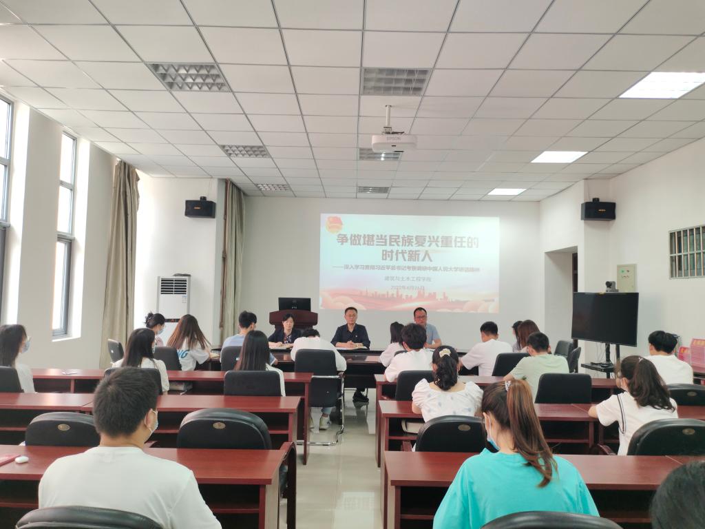 4月27日,建筑与土木工程学院在综合实验楼206会议室举行“争做堪当民族复兴重任的时代新人”主题团日活动,深入学习习近平总书记在中国人民大学考察时的重要讲话精神。学院党委书记方明科、党委副书记冀鹏、专职组织员张海燕和40余名学生会、社团和班级团支部学生骨干参加学习活动。会上,与会师生通过央视新闻联播收看习近平总书记的重要讲话相关报道。学生党员李智超、学生团干部刘夏瑜等同学结合个人思想、学习和工作实际畅谈学习体会,努力做到坚定不移听党话、跟党走,争做堪当民族复兴重任的时代新人。