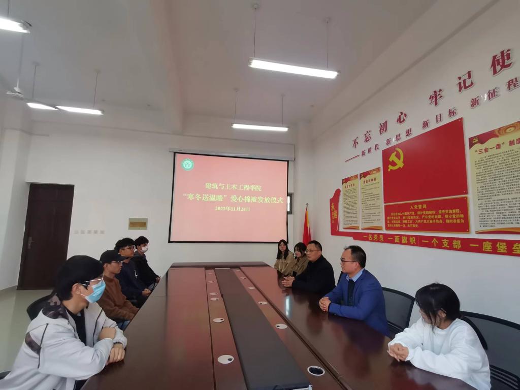 活动中,方明科宣读了《建筑与土木工程学院2022年“寒冬送温暖”爱心棉被资助学生名单》,方明科、冀鹏为受资助学生现场发放了爱心棉被。