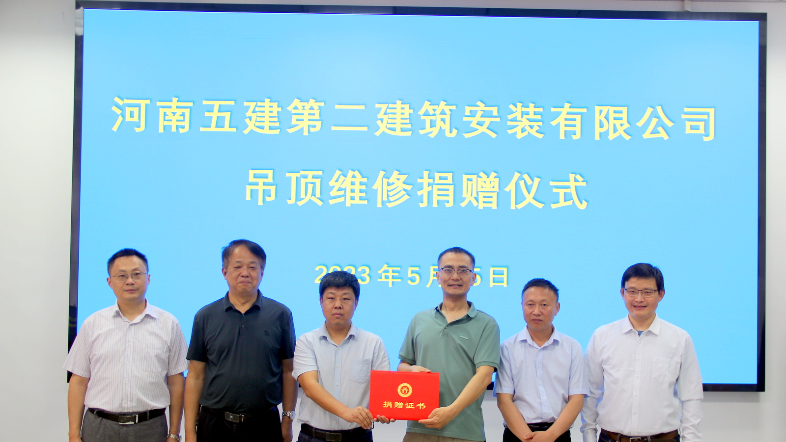 5月15日上午,河南五建第二建筑安装有限公司吊顶维修捐赠仪式在建筑与土木工程学院206会议室举行。河南五建第二建筑安装有限公司副总经理吴建功、总工程师徐礼赞、项目经理贾善磊,永利集团官网党委书记方明科、院长周葆春、办公室主任周峰参加了捐赠仪式。