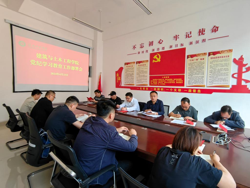 4月23日,建筑与土木工程学院召开党纪学习教育工作部署会,根据党中央、全省、学校党纪学习教育工作安排,对学院党纪学习教育工作进行安排部署。学院党委全体班子成员,党支部书记参加会议,会议由学院党委书记方明科主持。