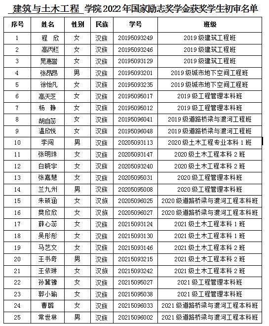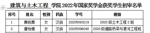 根据《信阳师范学院学生综合测评办法》、《信阳师范学院国家奖学金评定办法》(2020年修订版)、《信阳师范学院国家励志奖学金评定办法》(2020年修订版)等有关规定,经过学生个人申请、班级评议、学院学生工作领导小组评定、规定范围内公示等程序,拟确定黄锐茜等2名同学为国家奖学金候选人、高丙栏等25名同学为国家励志奖学金候选人,现予以公示,请广大师生监督。公示期间,如有异议,请于2022年10月7日18点前,通过电话、电子邮件等方式向建筑与土木工程学院学生工作领导小组反映。
